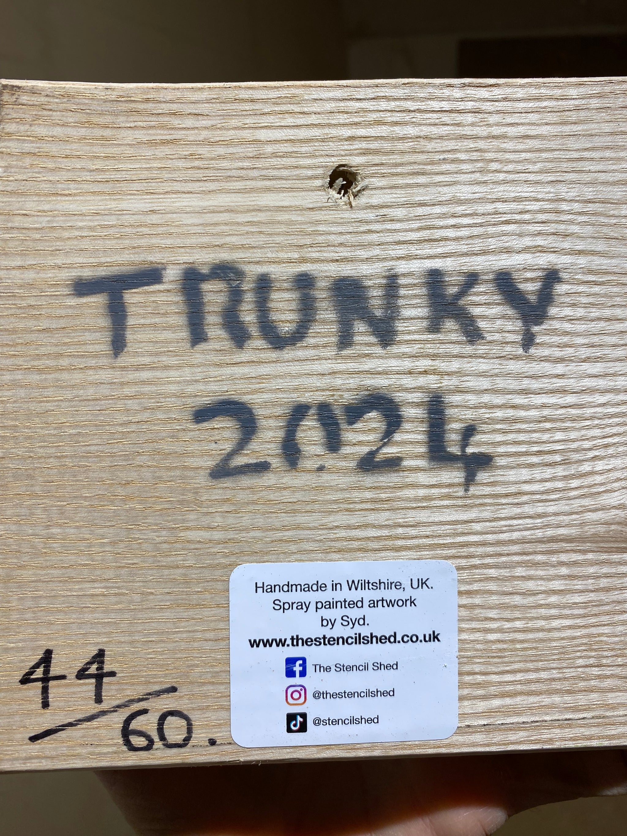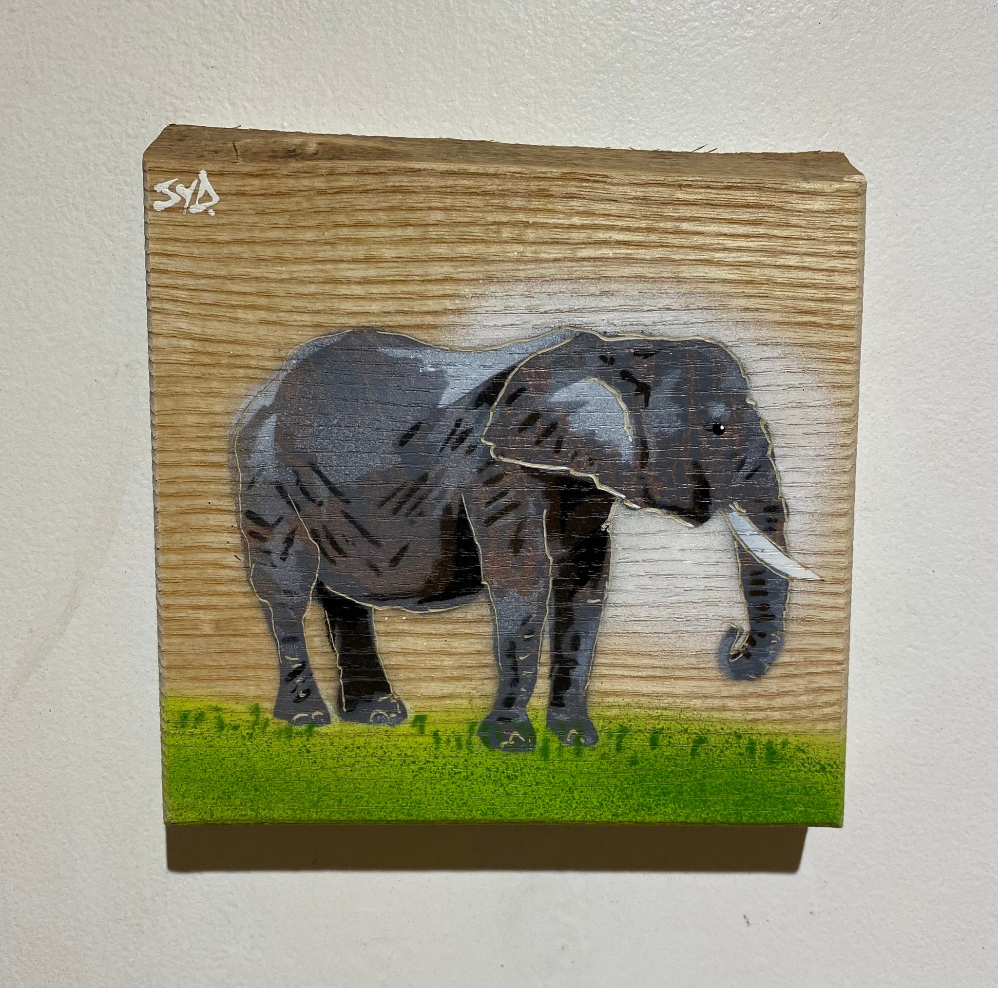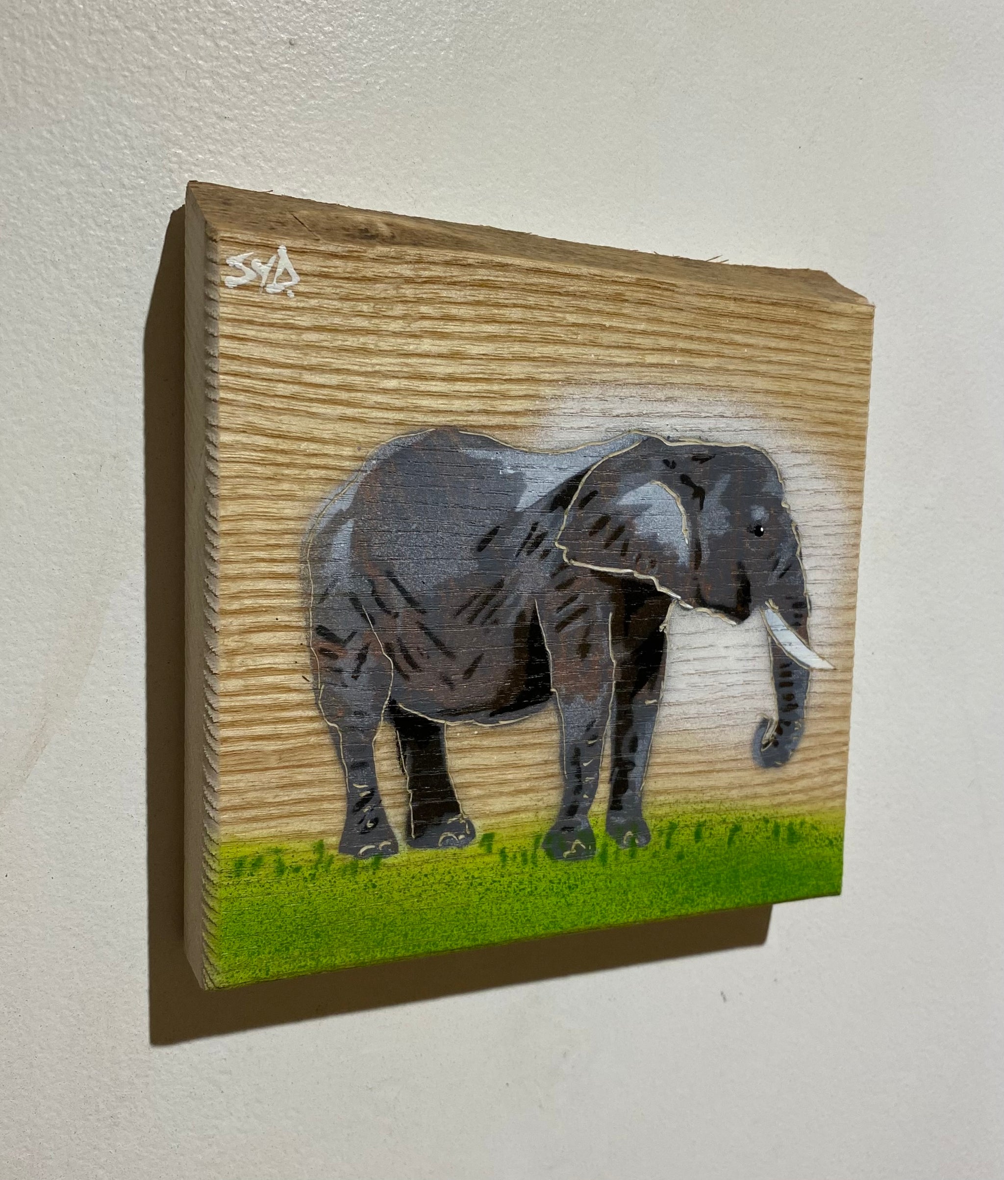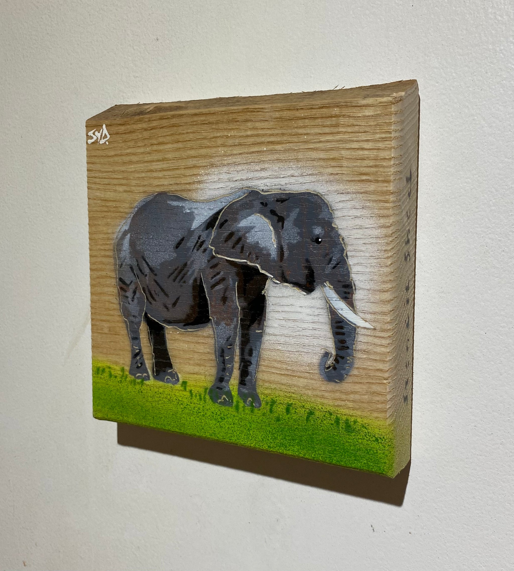 Elephant ‘Trunky’ - Fun side angle with copper spray paint marble effect, highly detailed stencil art on beautiful piece of Ash wood. All the wood used...