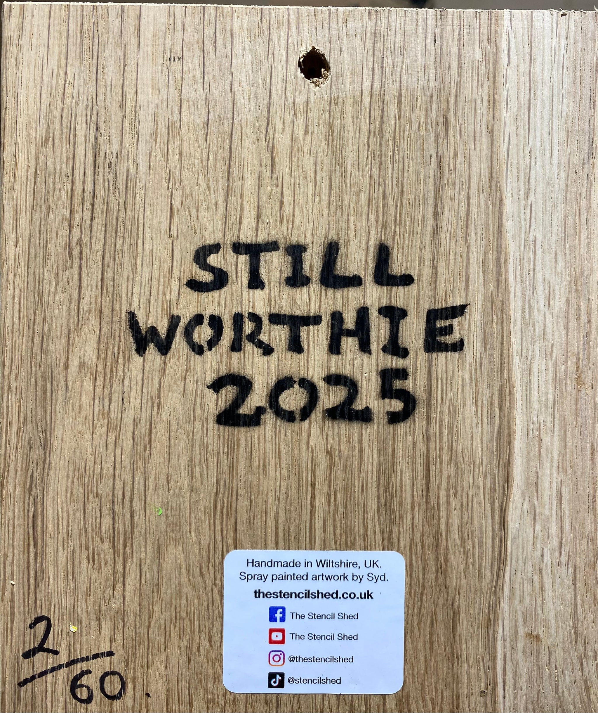 Still Worthy Cow - New for Christmas 2025 - Number 1 - Signed limited edition spray painted art on Oak wood - size 20 x 25cm