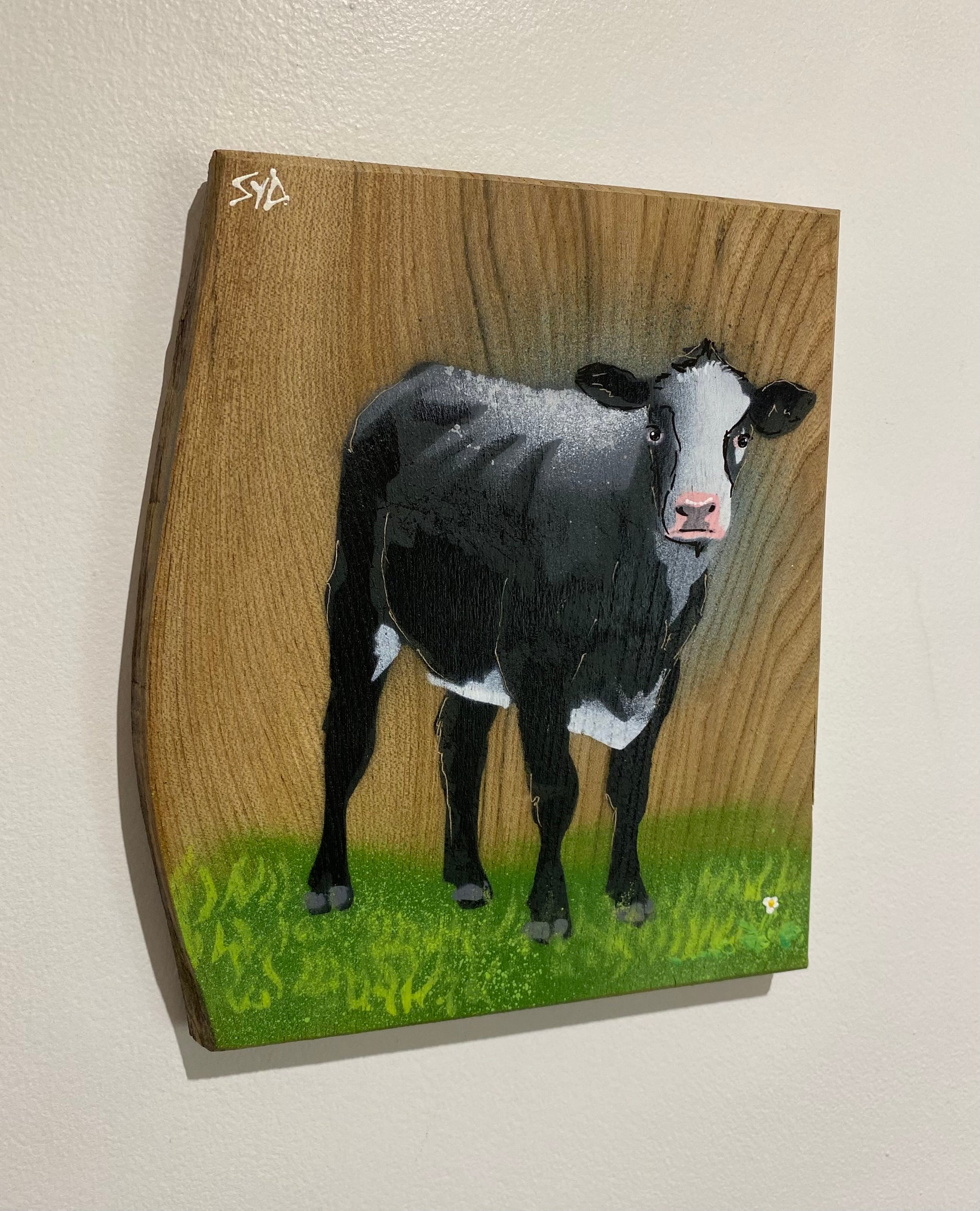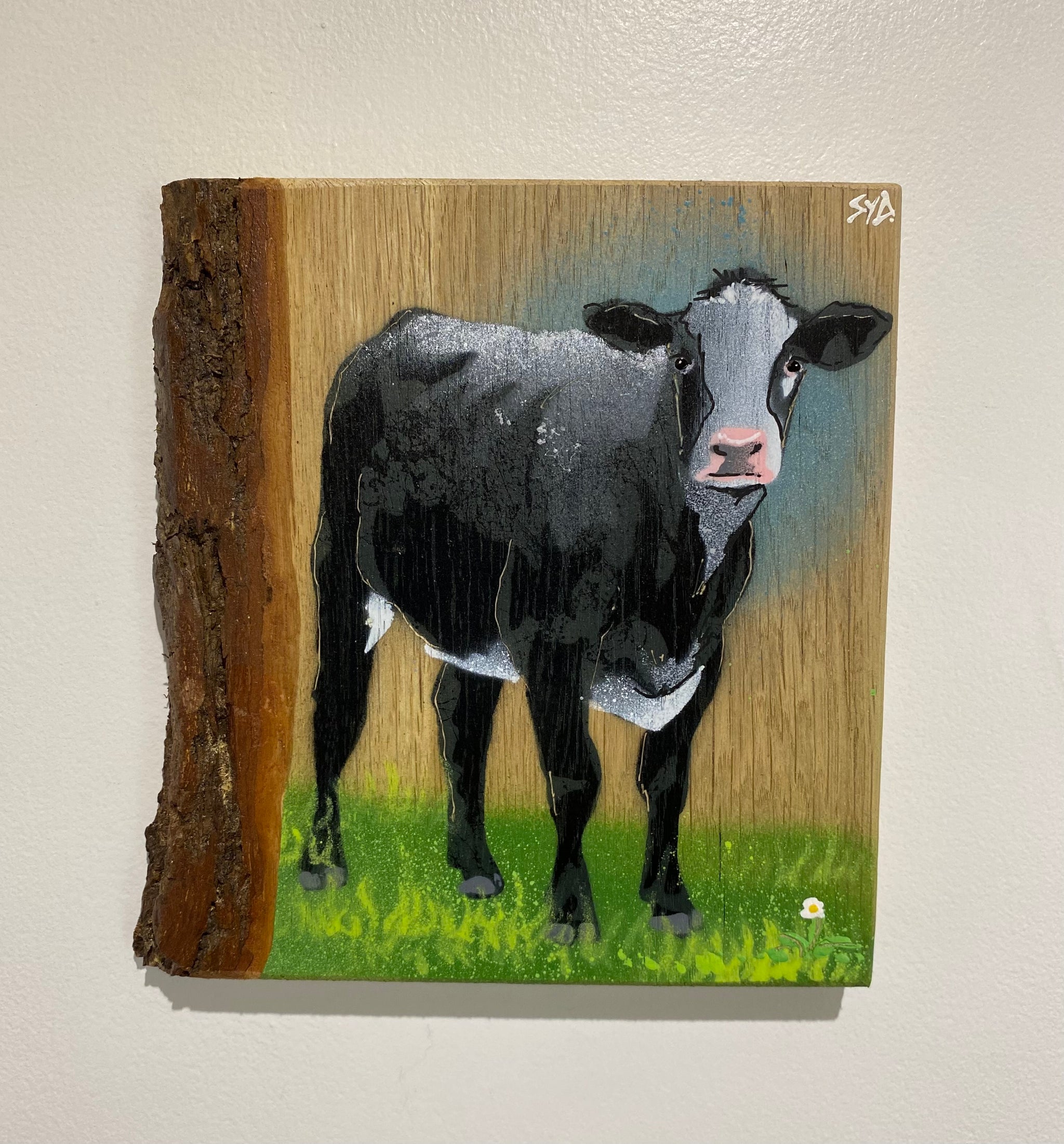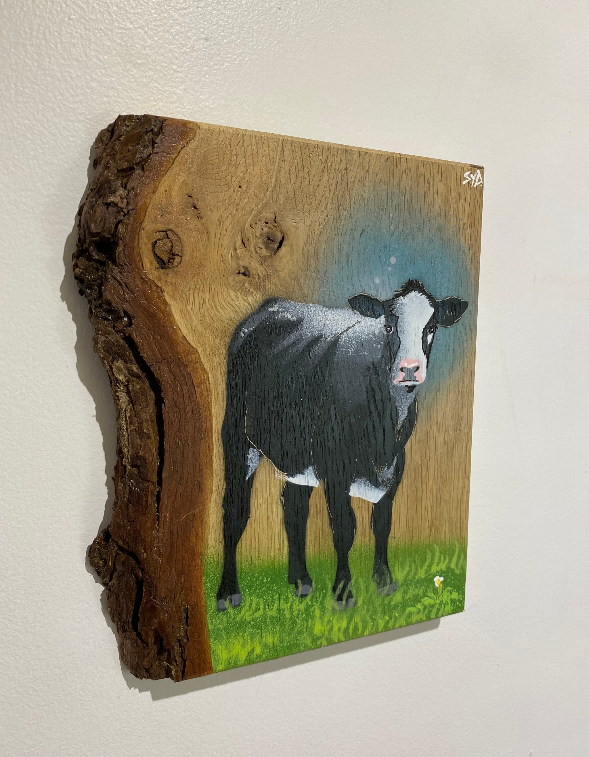Still Worthy Cow - New for Christmas 2025 - Signed limited edition Number 2 spray painted art on Oak wood - size 18 x 20cm