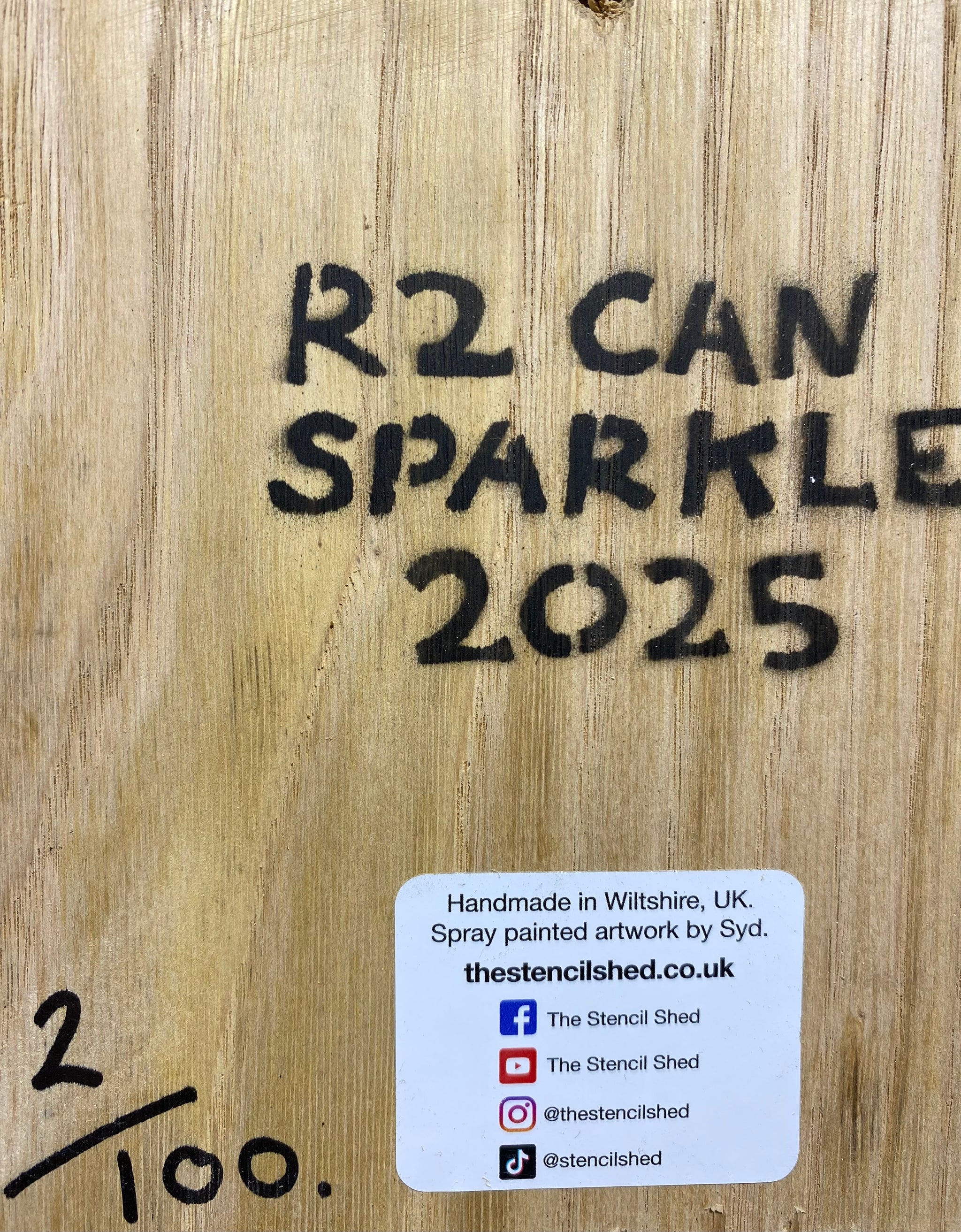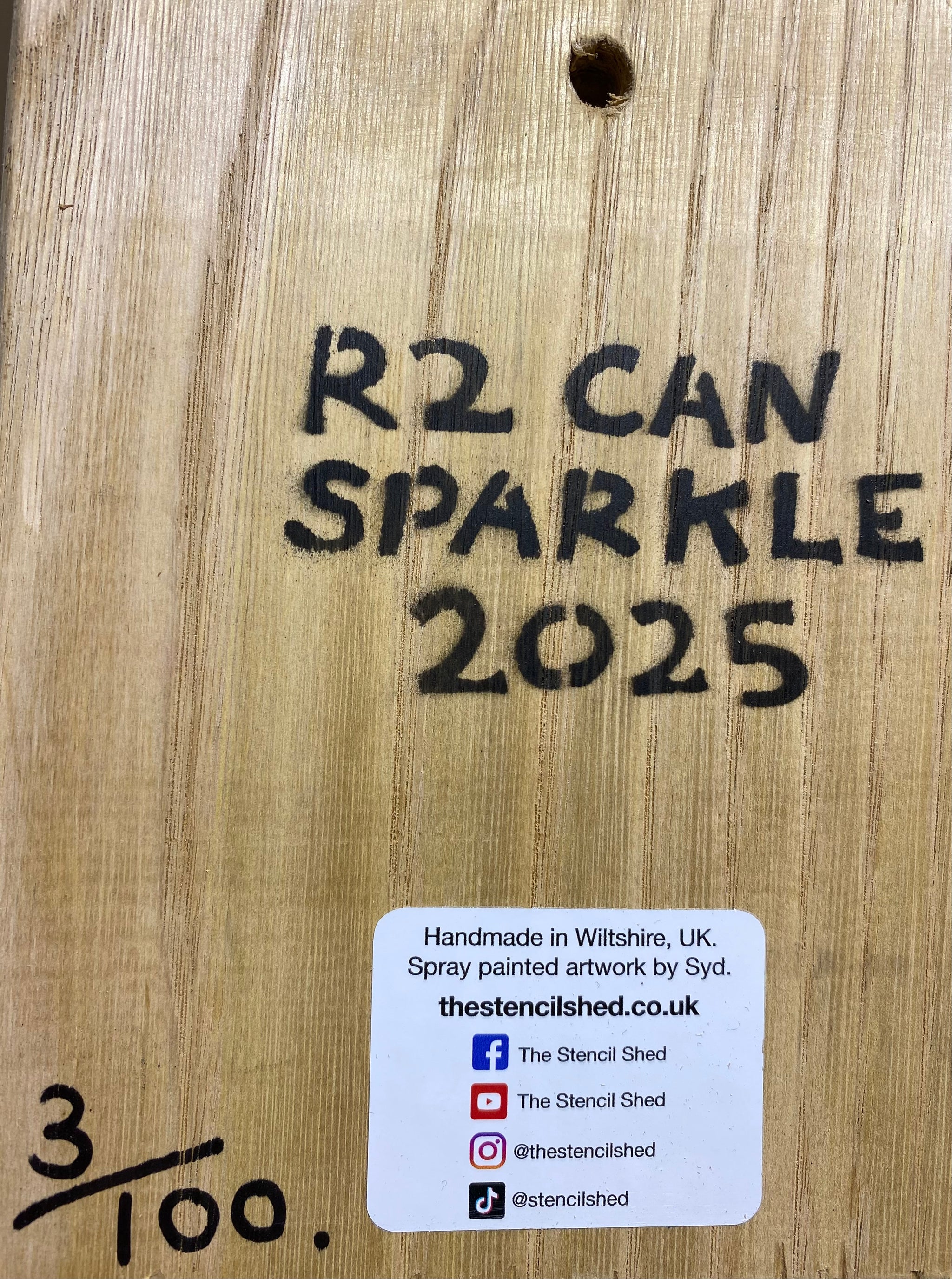 R2 Spray Can - Sparkle edition of this very popular Stencil Shed classic for Christmas 2025. The background to this piece is exceptional. Proper sparkles...