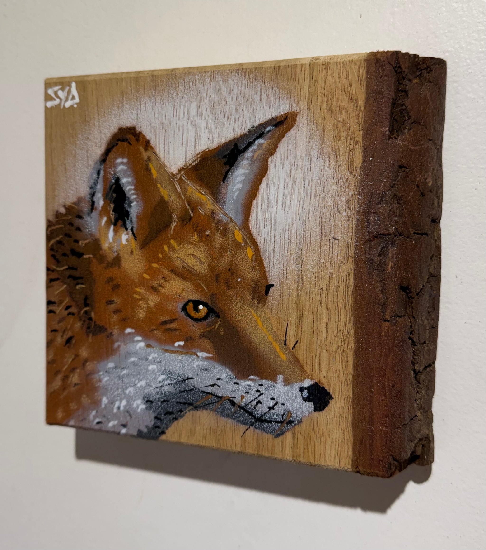 Fox 'Alert' on barky Oak wood - Size 15 x 14cm - Artwork No. 50 from Limited Signed Edition