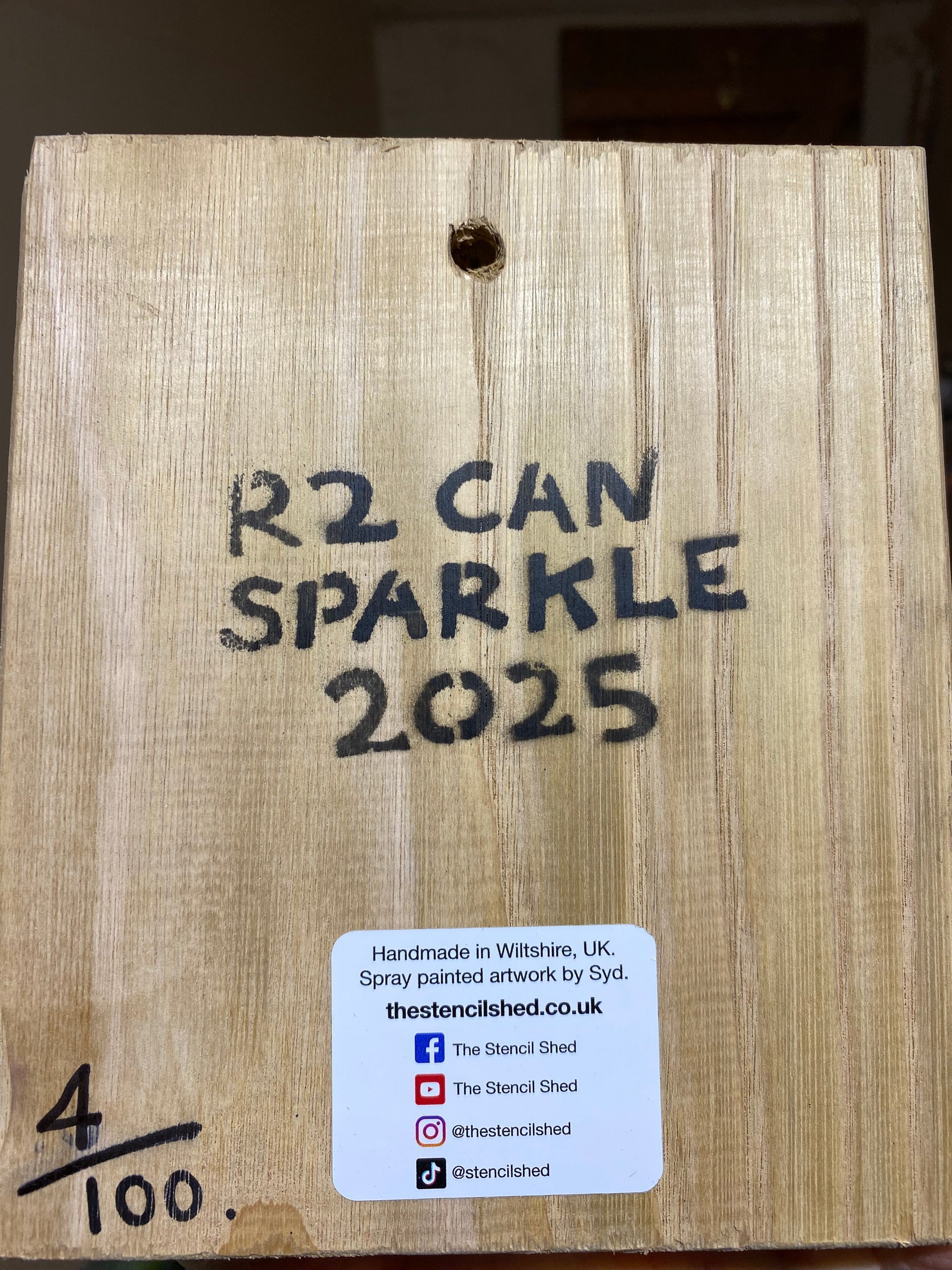 R2 Spray Can - Sparkle edition of this very popular Stencil Shed classic for Christmas 2025. The background to this piece is exceptional. Proper sparkles...