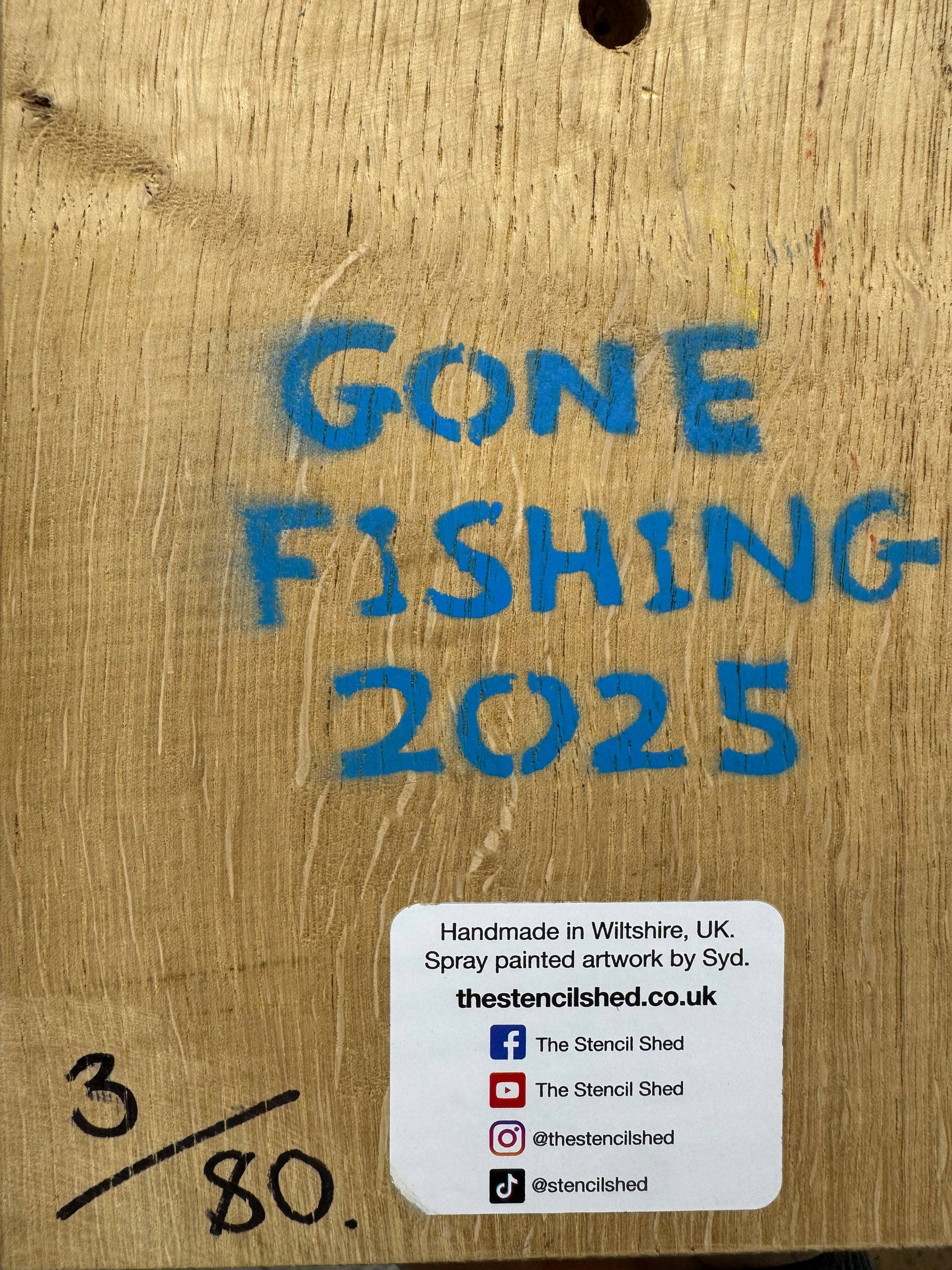 This particular artwork is number 3 and you will receive exactly what you see in the photo. Artwork name 'Gone Fishing' dated and named on the reverse and ready to hang. All the wood is sustainably sourced from the UK.